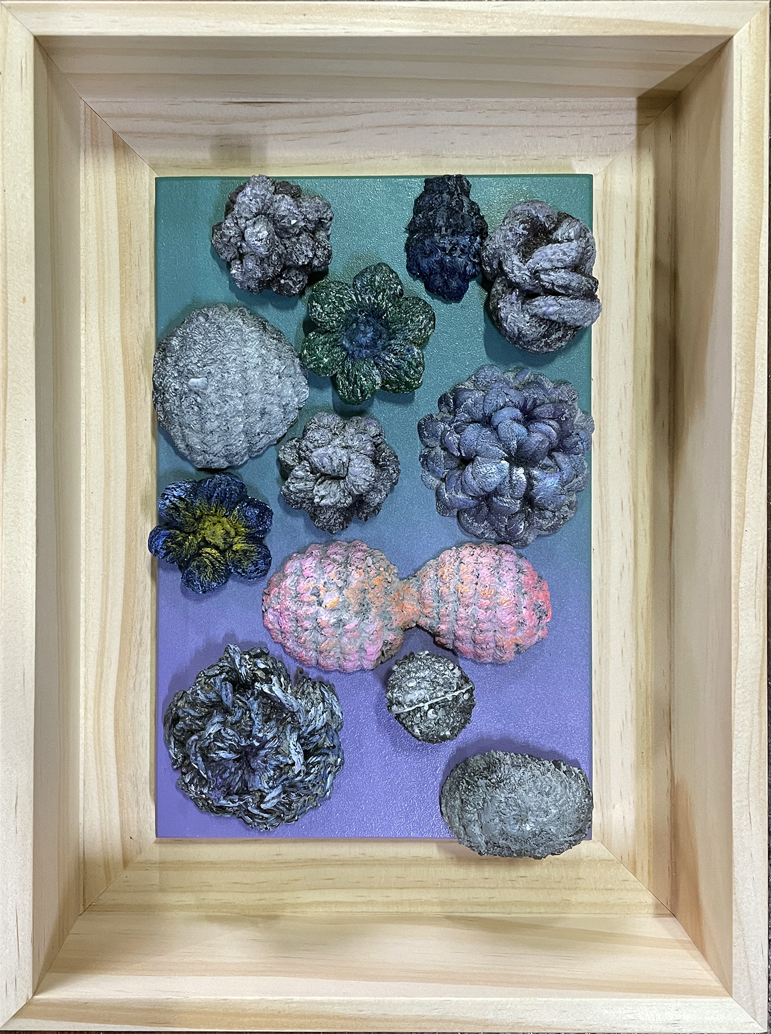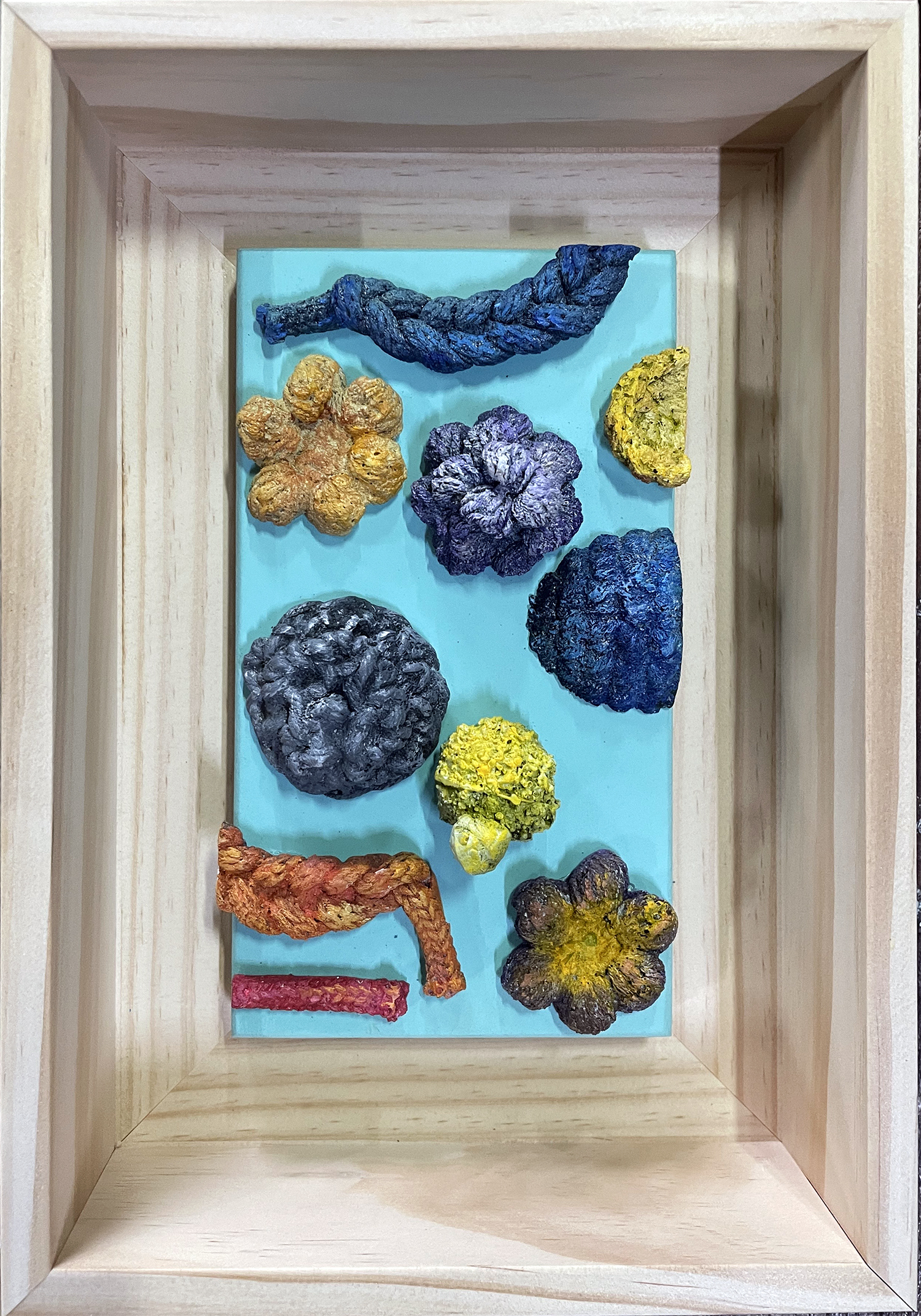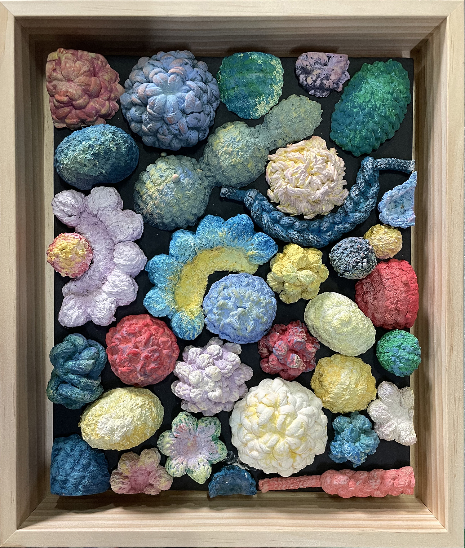 윤지영의 작업은 내면에 쌓여가는 감정의 층위들을 금속 위에 눌러 새기는 과정을 통해 시작된다. 자연의 이미지를 단순화한 형태 위에 부식과 광택의 흔적을 더해, 내면의 심리적 밀도와 외면의 형식을 병치시키는 것이 특징이다. 작가는 사회적 위장과 정체성의 분열, 감정의 억압과 드러냄 사이에서 생겨난 심리적 풍경을 시각적으로 구현하며, 감정이 가라앉은 자리에 머물러 있던 조각들을 조형적 덩어리로 재구성한다.